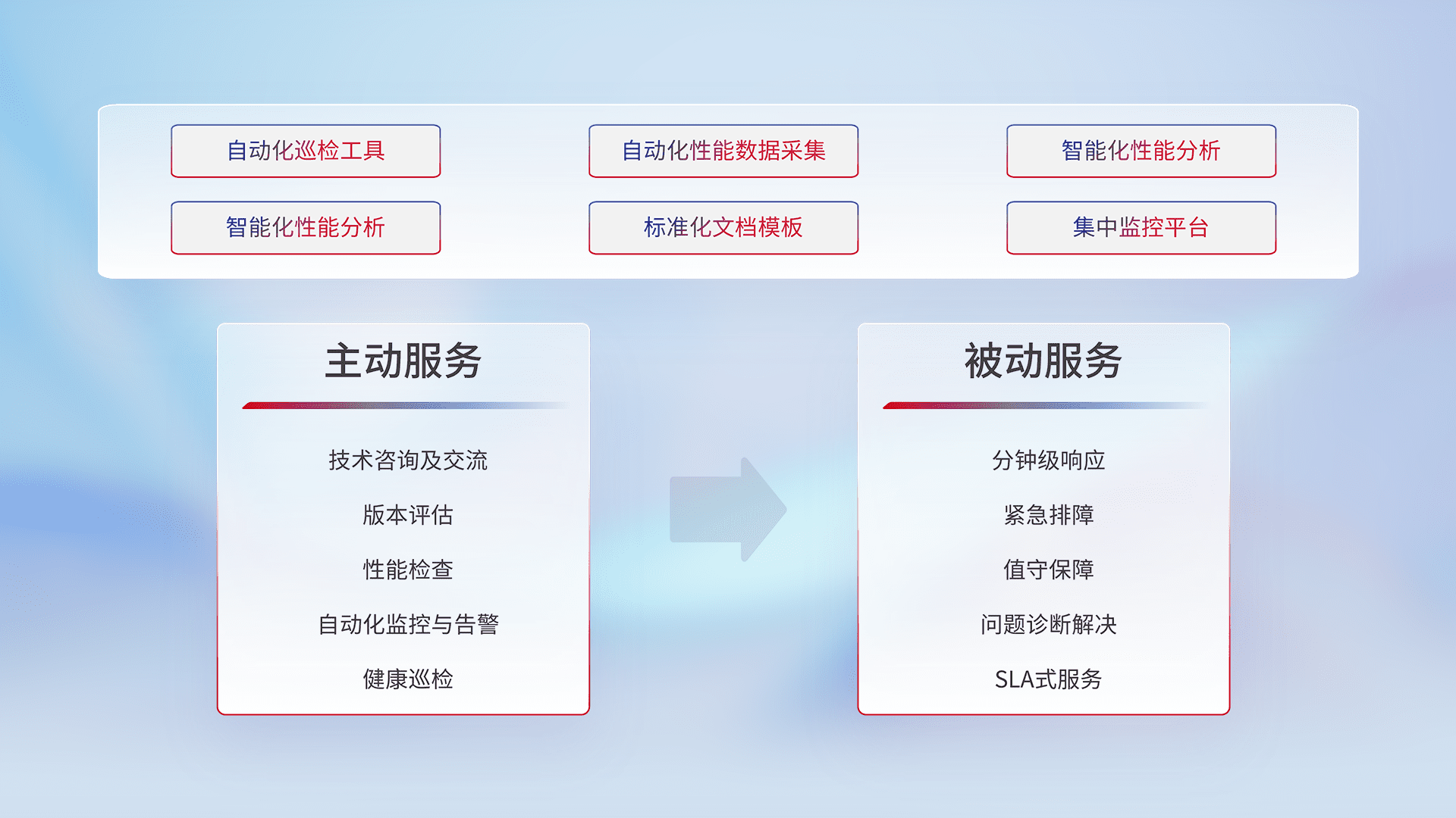 智能化工具和标准化文档,,,,保障服务质量,,,提供主动服务(包含技术咨询、、、版本评估、、、、性能检查、、、自动化监控与告警、、、健康巡检)和被动服务包含(分钟级响应、、、、紧急排障、、值守保障、、、问题诊断解决、、、、SLA服务)。。。